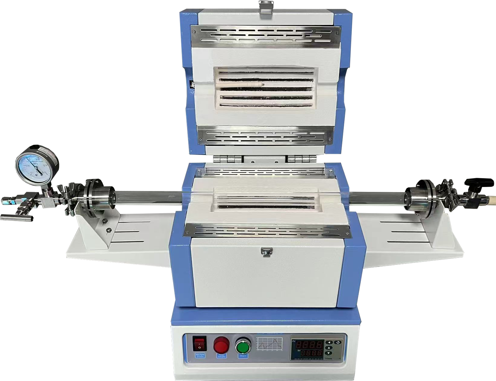 ?爐體結構:配有一對不銹鋼密封法蘭,采用硅膠密封圈密封;石英管口徑可選:φ25或φ50;真空度:10-2torr(采用機械泵)安裝有一機械壓力表,測量范圍為-0.1~0.15MP。
